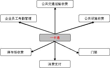 在许多人印象中,一卡通最大用途就是用于支付公车、地铁、渡轮等交通工具的费用。或者在某些“城市一卡通系统”建设比较早的城市,除了用于交通运输领域,还会用于小额的消费支付。如在一些快餐店、博物馆、图书馆、超市、自动售货机等场所,用手上的一卡通即可代替现金方便地完成消费支付。 其实,“城市一卡通系统”除了包含公共交通运输的支付的功能,还包含小额消费支付、停车场自动收费应用、各场所门禁管理和企业员工考勤管理等功能,应用范围概括为下图: