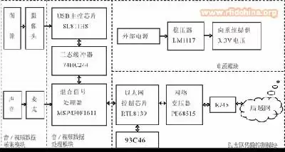 系统工作时,由MSP430F1611和SL811HS控制作为USB从设备的摄像头,并读入视频数据,对其进行处理和存储。同时,将麦克风中的音频数据读入MSP430F1611进行数据转换和存储。然后,将经过传输层、网络层封包后的IP数据报由RTL8139封装成以太网帧,再经过以太网变压器PE68515传输到局域网上。