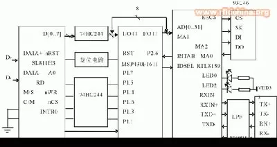 图2中,SL811HS的M/S接低电平,工作在主机模式下。CM接低电平,使系统工作在48MHz。由于MSP430F1611既要与SL811HS相连,又要与RTL8139相连,而SL811HS的引脚本身无三态功能,所以在MSP430F1611与SL811HS之间需要加三态缓冲器74HC244,以达到三方通信的目的。SL811HS通过缓冲器接MSP430F1611的I/O口; 中断请求端INTR0直接与单片机的I/O口P1.1相连,SL811HS传输完数据后产生高电平输出。通过单片机定时器检测设备状态,如果发现从设备接入,则触发外部中断。MSP430F1611大部分引脚作为I/O口,主要用来与SL811HS和RTL8139通信。