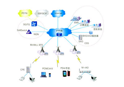 McWiLL系统由终端设备、无线系统以及网元管理系统(EMS)三个部分组成。其中,CPE、M-IAD、PCMCIA卡、宽带手机等终端完成用户端设备与无线网络的连接,基站系统完成用户终端与骨干网络的连接,语音业务汇聚网关与NGN配合提供大容量语音通信功能。EMS完成对无线系统中的所有终端设备、基站系统的设备管理、系统监控、权限管理、带宽分配等操作。