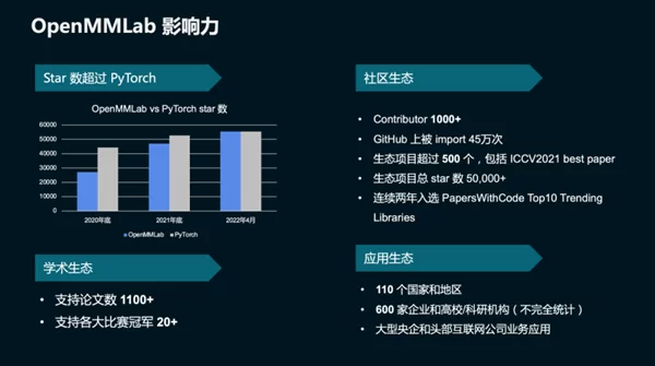 近4年来,OpenMMLab的国际影响力持续增长,目前在GitHub上获得了58,000个Stars,超过了业内顶级的深度学习框架PyTorch的数量。同时,OpenMMLab还支持了上千篇论文的发表,并协助几十项比赛选手在垂直领域获得了冠军。此外,在生态影响力方面也有所建树。