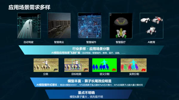 这些算法模型对硬件的适配带来了极大挑战,每一个模型的算法适配都需要很大工作量的投入,不同应用也涉及不同的算法。算法是衔接应用价值和芯片计算能力最关键的桥梁。