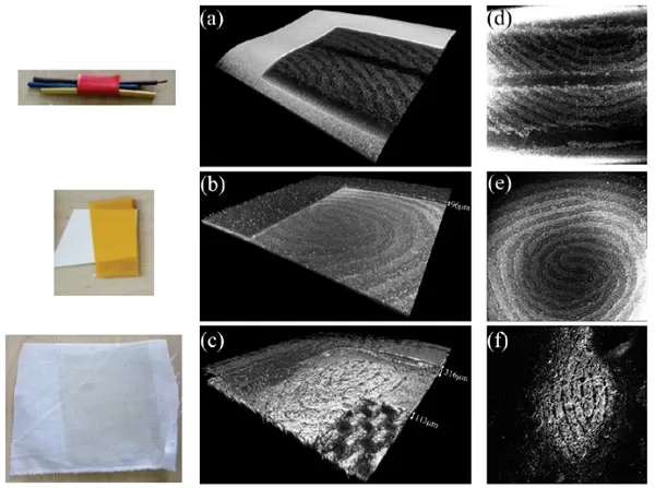 绕在三根导线上的电工胶带、粘在纸箱上的封箱胶带、粘在白布上的4层透明胶带的指纹切角三维OCT图与横切面成像图