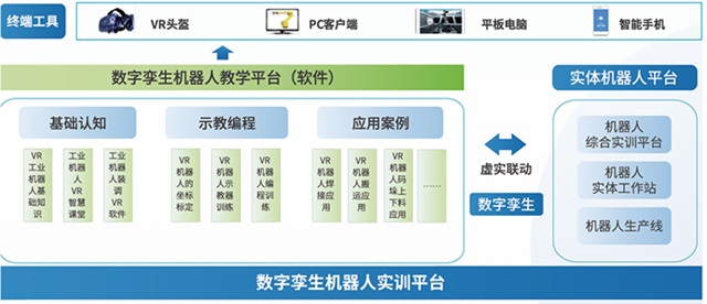 数字孪生机器人教学平台软件充分利用虚拟现实技术(VR),在虚拟环境下实现对机器人的知识学习和体验真实环境应用。