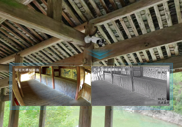 在前线为守护古廊桥“站岗”的,是海康威视智能物联设备。可见光技术与红外热成像技术相融合,对桥体进行24小时温度监测,如发现有温度异常的潜在隐患,可第一时间报警并通知相关负责人,将火灾隐患扼杀在苗头,大大降低起火概率和扑救难度,助力提高异常情况处置效率。