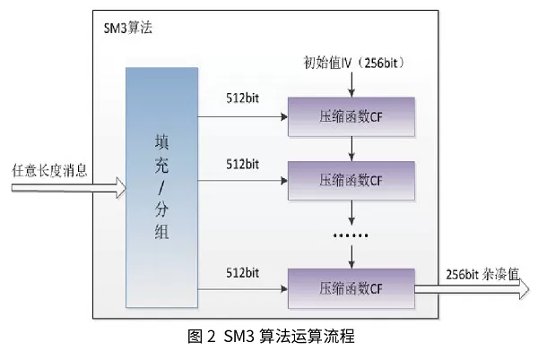 SM3算法是一种杂凑算法,任意长度的数据经过SM3哈希运算后会生成长度固定为256bit的杂凑值。SM3算法的逆运算在数学上是不可实现的,即通过256bit的摘要无法反推出原数据的内容,因此,在信息安全领域内常应用SM3算法进行信息的完整性度量。