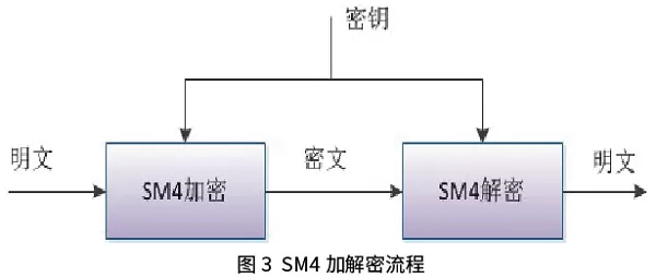 SM4算法是一种对称分组密码算法,128bit为一组进行加解密。密钥也固定为128bit,使用某一密钥加密后的密文只能用该密钥解密出明文,故而称为对称加密。SM4算法采用32轮非线性迭代实现,解密算法与加密算法的结构相同,只是轮密钥的使用顺序相反,解密轮密钥是加密轮密钥的逆序,SM4算法加解密速度较快,常应用于大数据量的加密,加解密流程如图3所示。