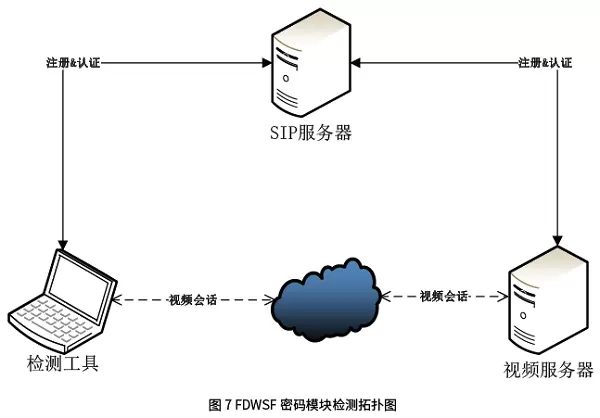 FDWSF密码模块模拟终端视频设备,对SIP服务器和视频服务器设备进行注册认证,控制信令,以及视频加解密检测,如图7所示。