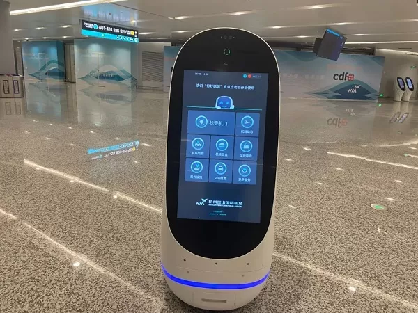 在候机厅里,作为“带路”的晓瑞机器人成为全场吸睛焦点,它可以“带领”旅客到相应的登机口。在其屏幕上,具体路线、剩余时间等信息一目了然。
