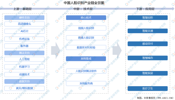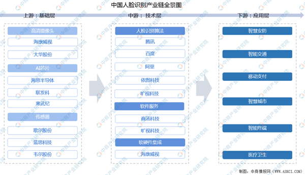 人脸识别产业链上游为基础层,包括高清摄像头、人工智能芯片、传感设备、基础算法和数据集;产业链中游主要由人脸识别算法、软件服务和软硬件系统集成服务等技术层构成;产业链下游则是具体的场景应用,如智慧安防、智能交通、移动支付等。