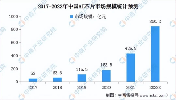 近几年来,AI芯片受到广泛关注,不断涌现出新的生产设计商,行业市场规模不断增长。数据显示,我国AI芯片市场规模由2017年的53亿元增至2021年的436.8亿元,年均复合增长率为69.4%。随着AI芯片应用领域扩大,预计2022年我国AI芯片市场规模将增至850.2亿元。