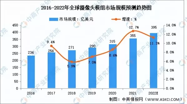 摄像头模组是在光学镜头的基础上,通过精密设计,整合图像传感器芯片、光学传动等而成的光学元器件。随着手机镜头配置的不断提升,高端摄像头模组的渗透率不断提升,带动全球摄像头模组规模不断提升。数据显示,全球摄像头模组市场规模由2016年的234亿美元增长至2020年的315亿美元,复合年均增长率达7.7%。中商产业研究院预测,2022年全球摄像头模组市场规模将达395亿美元。