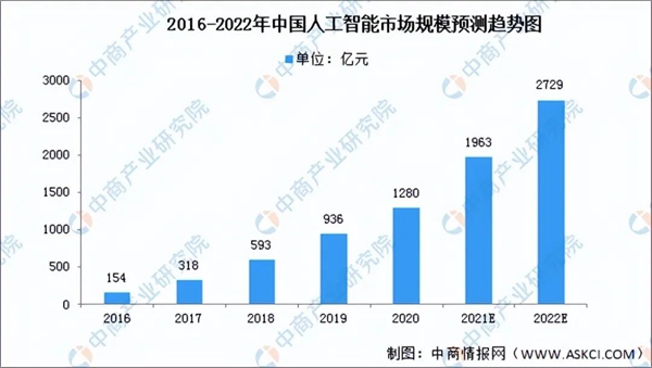 中国人工智能市场规模在2016年-2020年持续增长,市场规模从2016年的154亿元增长至2020年的1280亿元,年复合增长率达到69.79%。随着新基建产业愈发受到国家重视,人工智能产业未来将持续增长,预计2022年将达2729亿元。
