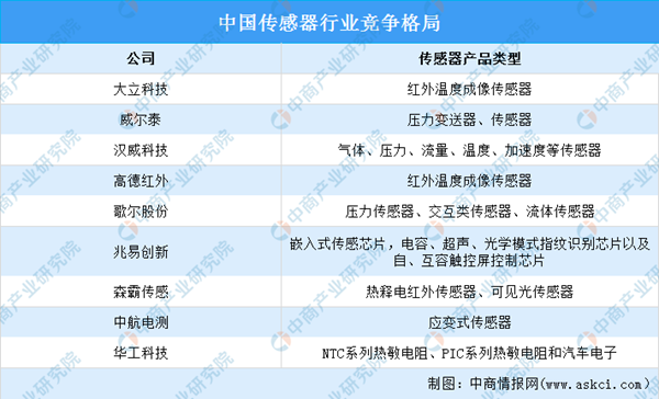 从竞争格局来看,我国传感器行业TOP5占据了国内传感器市场40%以上的份额,行业竞争格局逐渐趋于稳定。其中,华工科技传感器产品主要应用于智慧出行、智慧家庭、智慧医疗、智慧城市等领域,是全球有影响力的传感器系统解决方案提供商,具有较强的竞争优势;大立科技是国内少数能够独立研发、生产红外热成像相关核心芯片,机芯组件到整机系统全产业链完整的高新技术企业,旗下传感器业务占比高达90%以上,主要生产红外温度成像传感器。