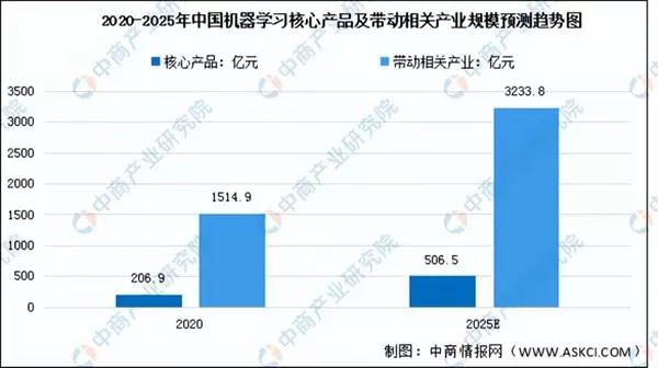机器学习是人工智能的关键技术之一,是人工智能核心,是使计算机具有智能的根本途径。初步估计2020年中国机器学习核心产品市场规模约为206.9亿元,带动相关产业市场规模达1514.9亿元。预计2025年中国机器学习核心产品市场规模将达到506.5亿元,带动相关产业市场规模也将增长到3233.8亿元。
