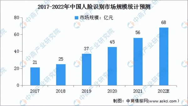 随着人脸识别技术的不断成熟,人脸识别技术逐渐被人们所熟知。同时,计算机、光学成像等相关技术的高速发展,人脸识别在各领域的应用不断拓展,人脸识别行业市场规模持续增长。数据显示,2020年中国人脸识别行业市场规模达到45亿元。随着人脸识别技术在各行业应用渗透的不断深入,预计2022年中国人脸识别市场规模将达到68亿元。