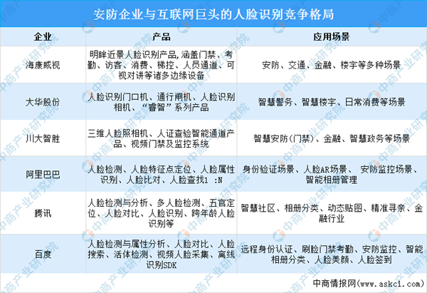 人脸识别的快速发展吸引了安防企业的产业布局,还带来了互联网巨头企业的投资进入。在安防企业方面,海康威视是作为全球领先的安防龙头,在人脸识别领域也有着重要地位,人脸识别产品主要为“明眸”系列近景人脸识别产品,广泛应用于安防、交通、金融服务和楼宇等场景。在互联网巨头方面,目前百度、腾讯、阿里分别利用自身云团队开展人脸识别技术研究,拓展应用场景。三大巨头云团队人脸识别产品均提供人脸检测、人脸对比等服务,应用场景不仅包含安防、门禁等领域,同时还在智能相册、人脸美颜、动态贴图等领域进行拓展。