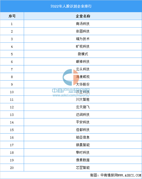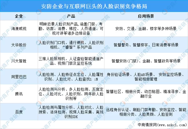从人脸识别产业链上游来看,摄像头方面海康威视、大华股份等企业水平较为先进;AI芯片方面海思半导体、联发科等巨头占据领先地位;传感器企业主要包括歌尔股份、蓝思科技等。从产业链中游来看,算法软件方面我国腾讯、百度、旷视科技、依图科技等企业已处在全球领先地位;软硬件集成中安防巨头海康威视、大华股份,以及汉王科技、川大智能等企业竞争较为激烈。