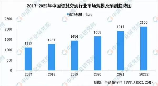 近年来,我国智能交通行业市场规模呈明显的上升趋势。2017年至2020年,智能交通市场规模由1119亿元增长至1658亿元,年均复合增长率为14%,预计2022年我国智能交通市场规模将达2133亿。