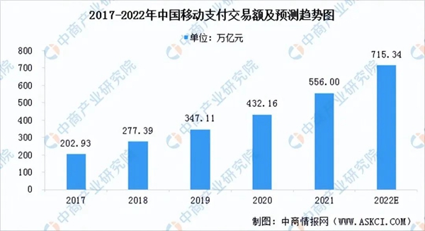 随着数字化转型的加速和消费者习惯的转变,移动支付逐渐成为我国社会主流的支付模式。根据中国人民银行的数据,中国移动网络支付交易额由2017年的202.93万亿元增长至2020年的432.16万亿元,年均复合增长率为28.66%,预计2022年中国移动支付市场交易额将达到715.34万亿元。