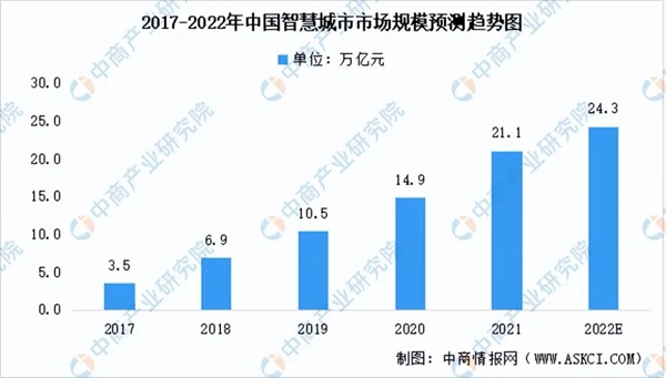 近年来,我国城市治理建设在经过概念普及、政策推动、试点示范之后,已经进入爆发式增长阶段,智慧城市、信息惠民、宽带中国等智慧城市相关试点已超过700个,开展新型智慧城市顶层设计的省会城市及计划单列市、地级市已分别达94%和71%。据中国信通院等数据统计,中国智慧城市市场规模近几年均保持30%以上增长,2021年市场规模达21.08万亿元,预计2022年其市场规模将达24.3万亿元。