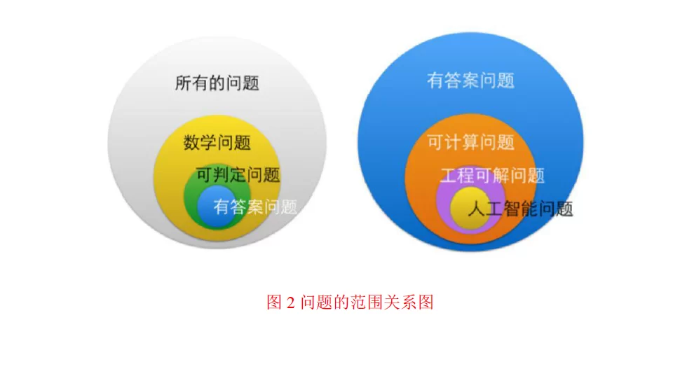 世界上所有的问题,数学问题只是问题的一小部分。数学其实能力非常有限,世界上有好多问题,完全不可能通过数学来解决。有些问题,还需要人脑来推理,不是计算机来计算。而理论上可计算的问题与工程上可以计算的问题是两回事,能够解决的实际问题,是工程上可以计算的问题。而人工智能的问题又是什么,是工程上可计算机工程问题中的很小的一部分。图2 是所有问题的范围关系。