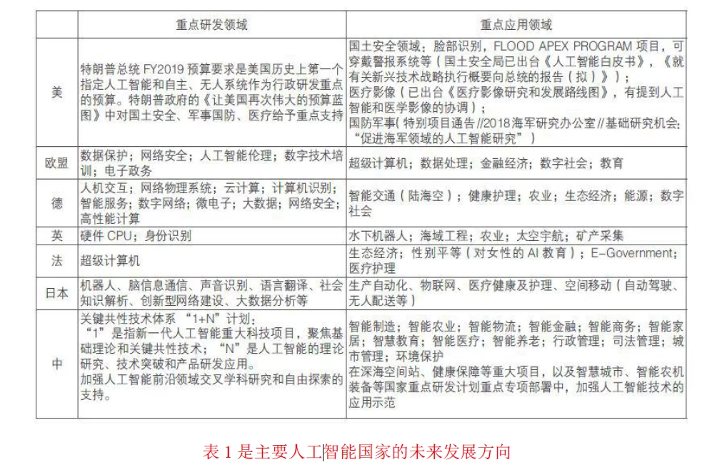 前三次工业革命使人类体力量外溢,而第四次工业革命则是人类的智力溢出,利用机器使人类获得巨大超能力!人工智能总体将向着规模化、安全化、健康化趋势发展;从全球层面来看,新一代人工智能产业将呈现四个发展趋势。表1是主要人工智能国家的未来发展方向。