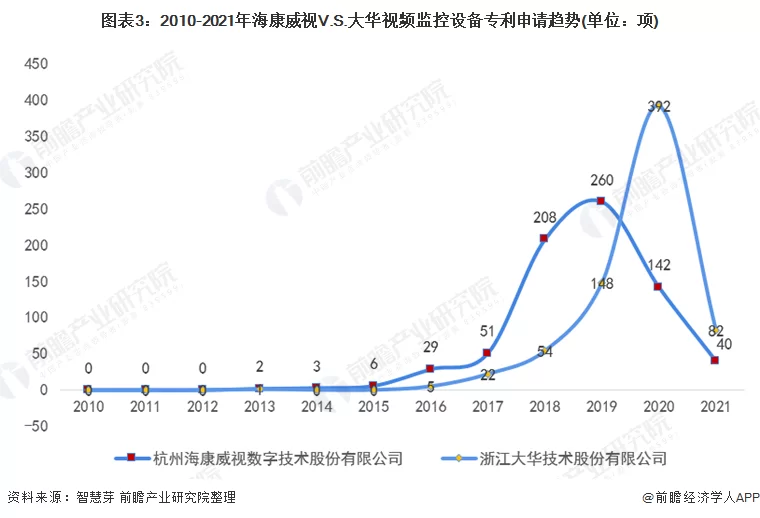 2020年,大华视频监控设备专利申请量赶超海康威视,两者视频监控设备专利申请量分别为392项赫尔142项。2021年1-8月,大华视频监控设备专利申请量为82项,海康威视视频监控设备专利申请量为40项。