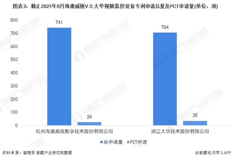 不过,在视频监控设备专利申请量方面,大华视频监控设备专利申请总量和海康威视视频监控设备专利申请量差不多,分别为741项和704项。