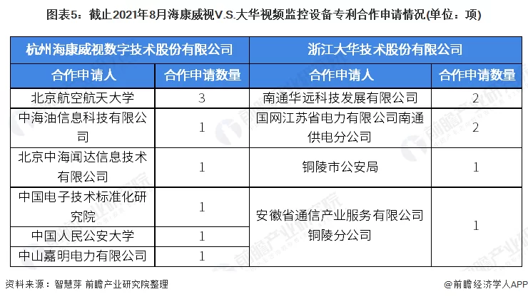 在专利合作申请方面,海康威视其它人合作申请视频监控设备专利数量较多,目前海康威视合作申请的视频监控设备专利数量共有8项,大华与其它人合作申请视频监控设备专利数量仅为6项。