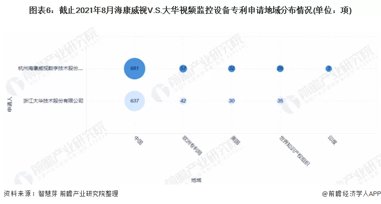 目前,大华和海康威视的视频监控设备专利申请区域主要集中在中国,两者在中国申请的视频监控设备专利数量分别为637项和681项。欧洲是两者视频监控设备专利申请的第二大地区,两者在欧洲专利局的视频监控设备专利申请数量分别为42项和57项。