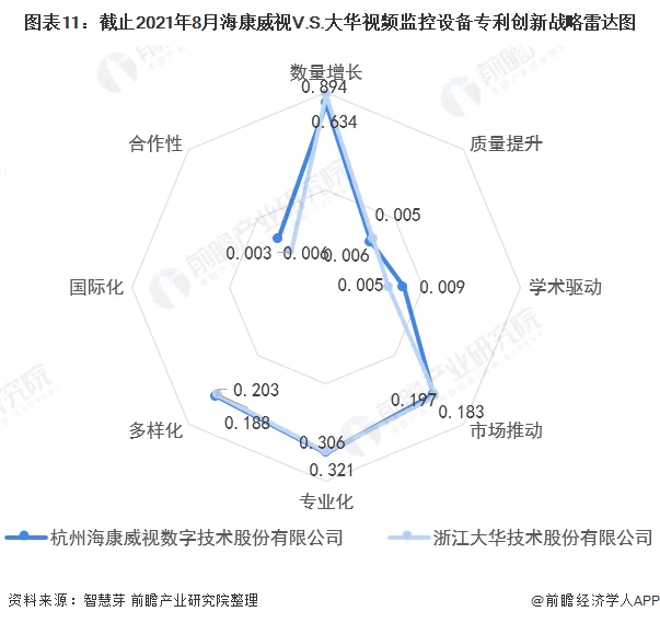 整体来看,海康威视视频监控设备技术在学术驱动、专业化、多样化和合作性具有相对竞争优势,大华视频监控设备技术则在数量增长、质量提升、市场推动上具有相对竞争优势。两者视频监控设备国际化方面有待改进。