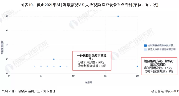 在重点专利布局上,大华重点布局的专利为“一种运镜系统及定焦镜头”,该项专利被引用次数9次,专利家族规模为1项。海康威视重点布局的专利为“视频编码方法、解码方法及其装置”,该项专利被引用次数17次,专利家族规模为8项。整体来看,海康威视重点布局的专利无论是在专利被引用次数还是专利家族规模均较大华多。