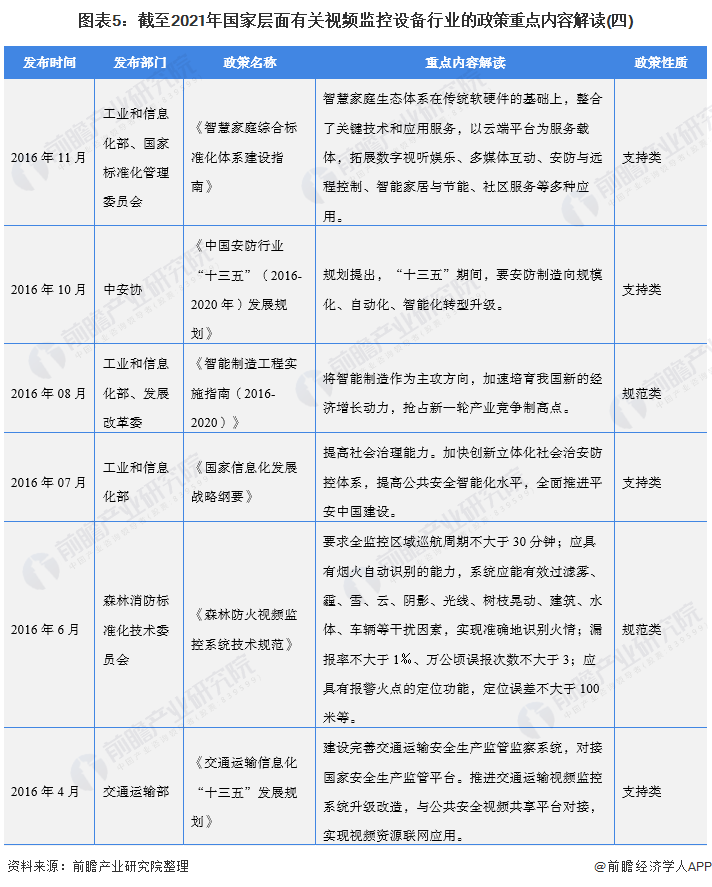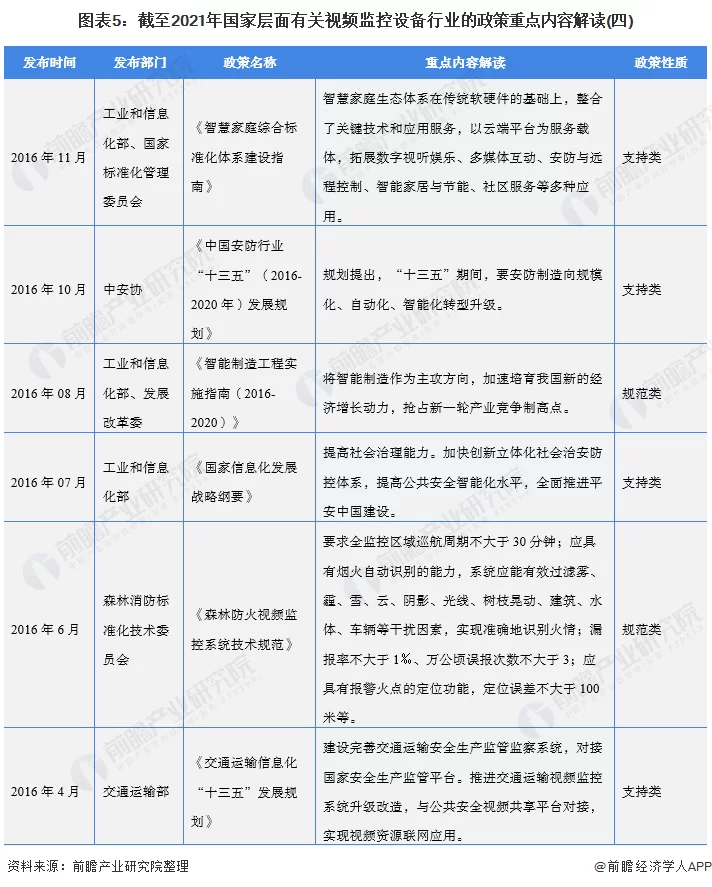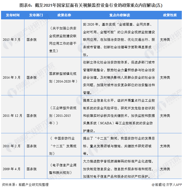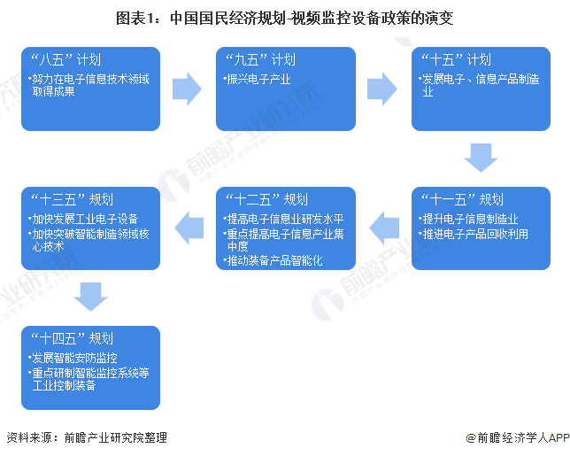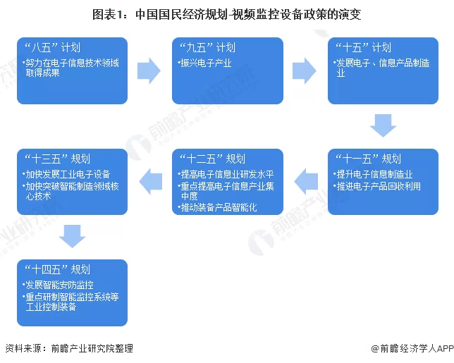 视频监控设备属于信息制造业,“八五”计划(1991-1995年)至“十五”计划(2001-205年)时期,国家层面提倡:努力、振兴、发展电子信息制造业;从“十一五”规划开始,规划对信息制造业的要求更具体化:如对电子产品的回收利用、产业集中化、产品智能化等。到“十四五”时期,根据《“十四五”规划和2035年远景目标纲要》,智能监控开始被直接提及,要求发展智能安防监控和研制智能监控系统等工业控制装备。