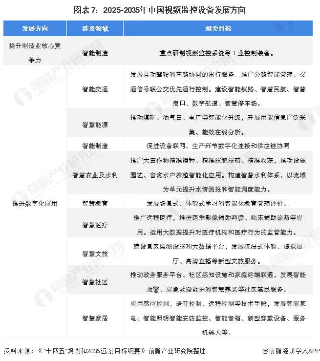 根据《“十四五”规划和2035远景目标纲要》,我国视频监控设备行业主要有两个发展方向:一是中游视频监控系统的研发,二是下游应用领域的数字化拓展。其中,在视频监控设备行业下游应用领域的数字化推进的重点行业主要有智能交通、智慧能源、智能制造、智慧农业及水利、智慧教育、智慧社区、智慧医疗、智能家居。