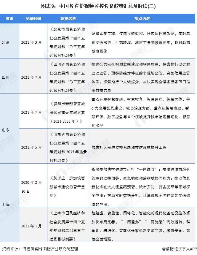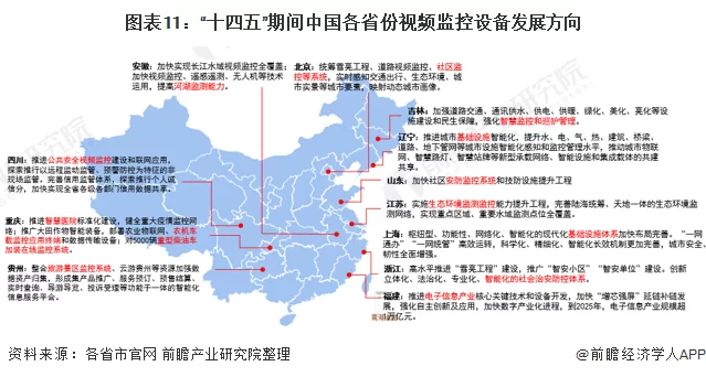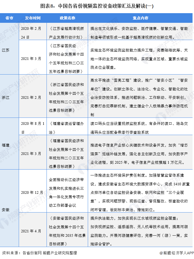 “十四五”期间,我国主要省份也提出了视频监控设备行业的发展目标,且不同城市的聚焦领域不同。其中,安徽省的政策制定主要集中在环境监测领域,浙江省主要为安防领域、贵州则主要为文化旅游领域。此外,福建、北京、四川也提出了视频监控设备项目的建设目标或规划:
