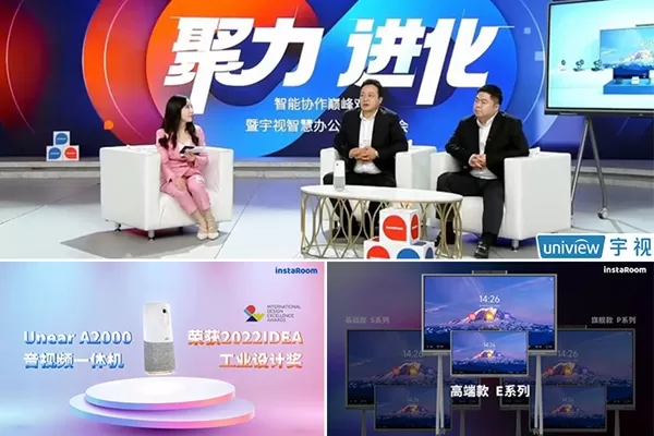 【安防在线 www.anfang.cn】 12月28日,“聚力-进化”智能协作巅峰对话暨宇视智慧办公新品发布会在线上火热举行。会上重磅发布了宇视InstaHub新一代高端款E系列会议平板,以及音视频一体机Unear A2000,分别采用瑞芯微新一代旗舰芯RK3588及机器视觉芯片RV1109。宇视科技总裁张鹏国与阿里巴巴集团副总裁/钉钉COO库伟、瑞芯微副总裁林峥源、迪显咨询音视频事业部副总经理汪雪婷,在巅峰对话中一起探寻未来办公的新模式。