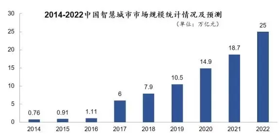 到 2020 年,中国智慧城市的支出将增长 12.7%,达到 259 亿美元,仅次于美国, 位居第二。另据前瞻产业研究院统计,2019 年中国智慧城市市场规模已突破 10 万亿, 并有望于 2022 年达到 25 万亿元。