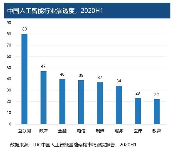 从人工智能行业应用渗透度排名来看,同2019年相比,互联网仍然保持第一,电信和制造行业的应用场景更加丰富,市场潜力预计将有较大的提升,在2020年上半年,医疗行业在新冠肺炎疫情的影响下加速了人工智能应用的落地,在多方面取得了显著的成效,也促使医疗行业人工智能应用渗透度超过教育行业位列第七。