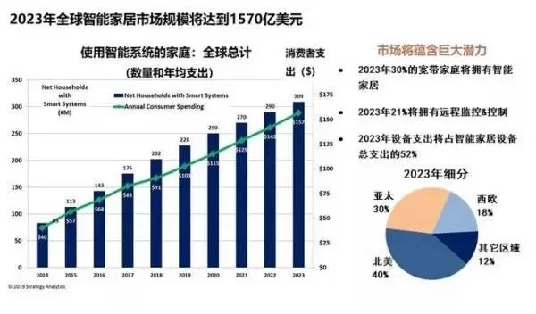 市场调研机构StrategyAnalytics最新发布的《2019年全球智能家居市场》研究报告预测,到2019年,消费者在智能家居相关硬件、服务和安装费用上的支出将达到1030亿美元(约合人民币7340亿元),并将以11%的复合年均增长率增长到2023年的1570亿美元。
