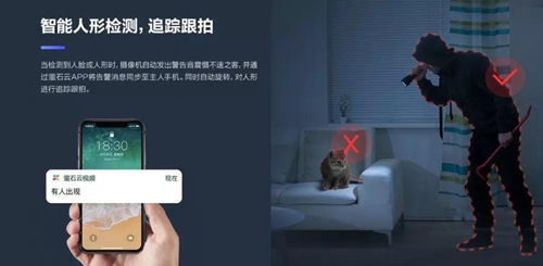 当检测到人脸或人形时,摄像机自动发出警告音震慑不速之客,并将告警消息同步至主人手机。同时,自动旋转时,还可对人形进行追踪跟拍,及时捕捉更全面的事态变化。
