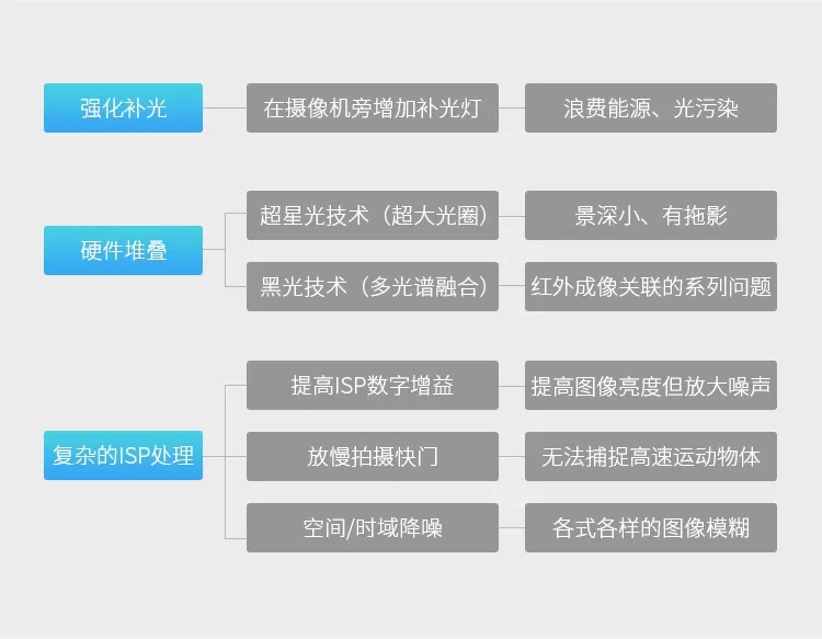 ▲传统低照成像主流解决方式及其问题