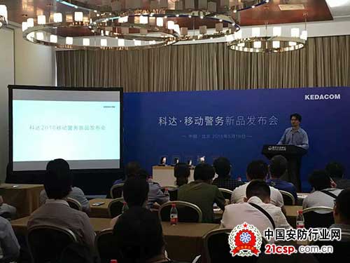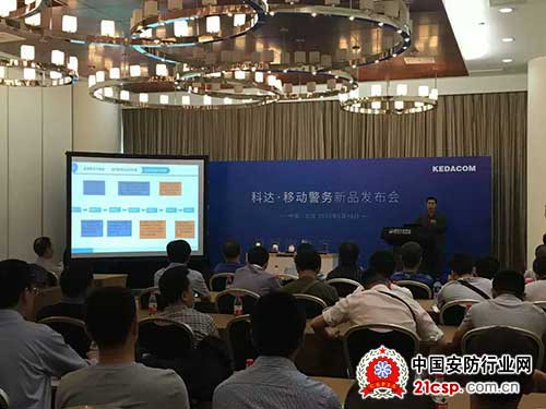 王理事长和陈总致辞后,由科达移动警务产品经理杨若扬先生正式介绍发布会的主角。此次发布会科达发布了3款明星级产品:第二代移动警务终端P1S,智能执法记录仪,视信通应用平台。