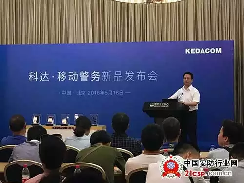 随后,科达总经理陈卫东先生致辞,为现场来宾回顾了科达在移动警务领域积累的成果。陈总介绍说,科达目前已经推出了三大系列移动警务相关产品:第一是6大系列移动终端,具体包括移动警务终端、智能执法记录仪、行车记录仪、移动单兵、移动车载以及移动便携图传;第二是警用穿戴系列设备,包括耳挂式摄像机、纽扣式摄像机、空气导管对讲耳麦、DV适配手环等;第三是视信通与智查通两大应用平台,在这两大平台上实现了9大类移动警务APP应用。