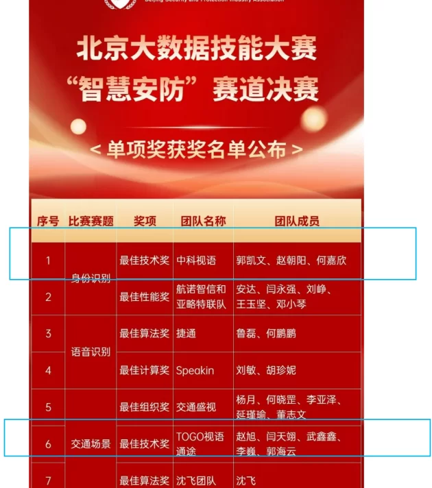 近日,由北京安全防范行业协会(简称“北安协”)主办,北安协、清华大学、北京工业大学共同承办的2022年北京大数据技能大赛“智慧安防”赛道决赛圆满落幕!中科视语凭借行业领先技术实力、综合实力及产业化应用实力,在50多个团队中脱颖而出,斩获“身份识别、交通场景”双赛题优胜奖和最佳技术奖双项大奖。