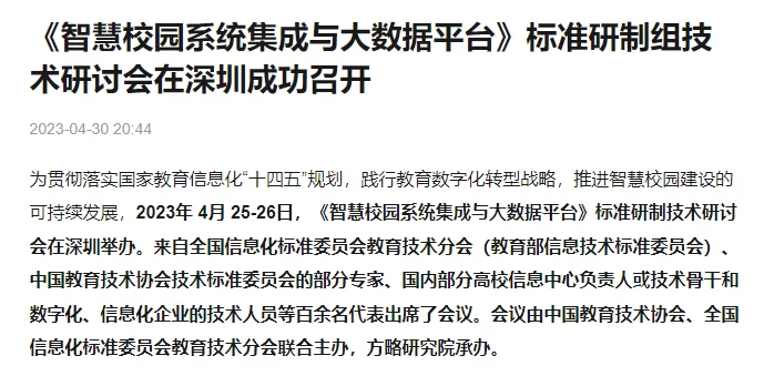 近日,《智慧校园系统集成与大数据平台》标准研制组技术研讨会在深圳成功召开。我国实行实施科教兴国战略,强化现代化建设人才支撑,对教育问题极其重视。同时,人工智能、物联网、大数据等新一代信息技术的迅猛发展也在引领教育变革。智慧校园通过数智赋能来实现学校信息化建设,是传统校园的升级和突破。
