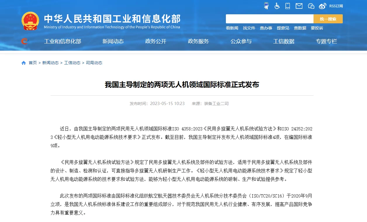 据工信部消息,日前,由我国主导制定的两项民用无人机领域国际标准ISO 4358:2023《民用多旋翼无人机系统试验方法》和ISO 24352:2023《轻小型无人机用电动能源系统技术要求》正式发布。截至目前,我国主导制定并发布无人机领域国际标准4项,在编国际标准9项。