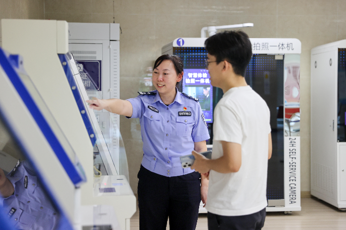 在珠海市公安局交警支队车辆管理所一楼业务大厅,民警陈晓冬引导群众使用智慧体检拍照一体机办理车管业务。