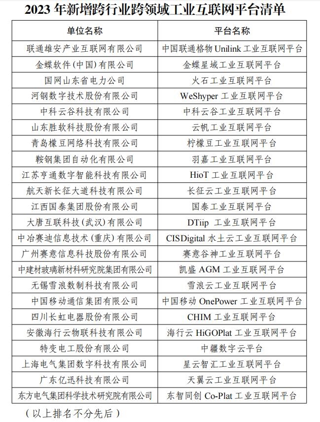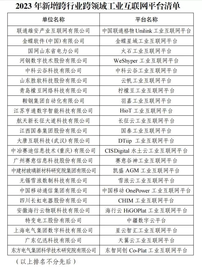 8月1日,工信部公示2023年新增跨行业跨领域工业互联网平台清单(以下简称“双跨”工业互联网平台),新增包括中国联通格物Unilink工业互联网平台、金蝶星域工业互联网平台、火石工业互联网平台、中国移动OnePower工业互联网平台、CHIM工业互联网平台、海行云HiGOPlat工业互联网平台、天翼云工业互联网平台等23个“双跨”工业互联网平台。
