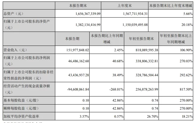 报告显示,大立科技2020年第三季度报告总营收为151,977,848.02元,同比增长2.45%;归属于上市公司股东的净利润为46,486,162.60元,同比增长40.68%。